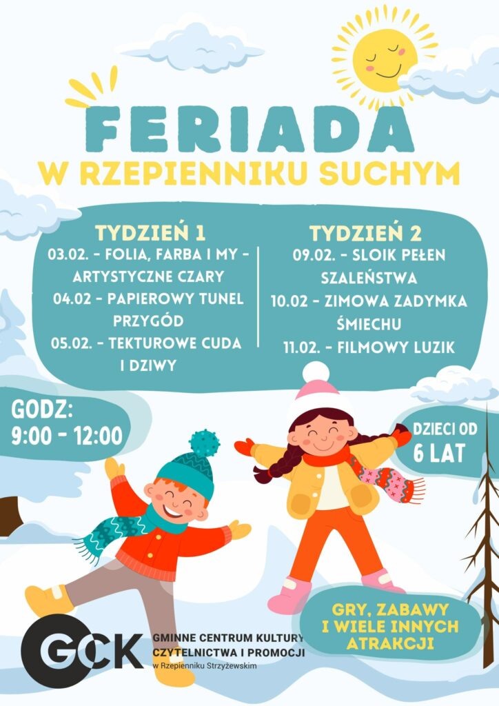 Data lut 05 2026 Czas 09:00 - 12:00 FERIADA w Rzepienniku Suchym Zapraszamy na zajęcia dzieci od 6 lat w czasie ferii szkolnych. Szczegóły na plakacie. Poleć to wydarzenie + Dodaj do Google Calendar + iCal / Outlook export 00 dni 00 godzin 00 minut 00 sekund
