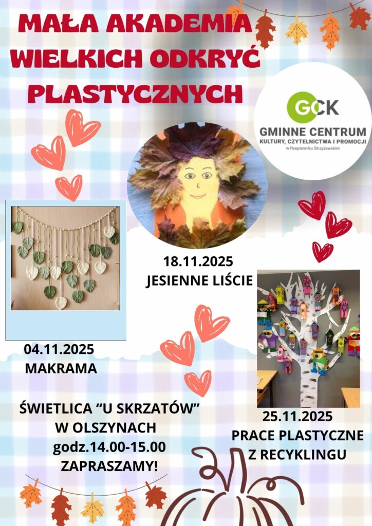 Data lis 18 2025 Czas 14:00 Mała Akademia Wielkich Odkryć Plastycznych w Olszynach Zapraszamy na zajęcia do naszej świetlicy w Olszynach. Szczegóły na plakacie. Poleć to wydarzenie + Dodaj do Google Calendar + iCal / Outlook export 00 dni 00 godzin 00 minut 00 sekund