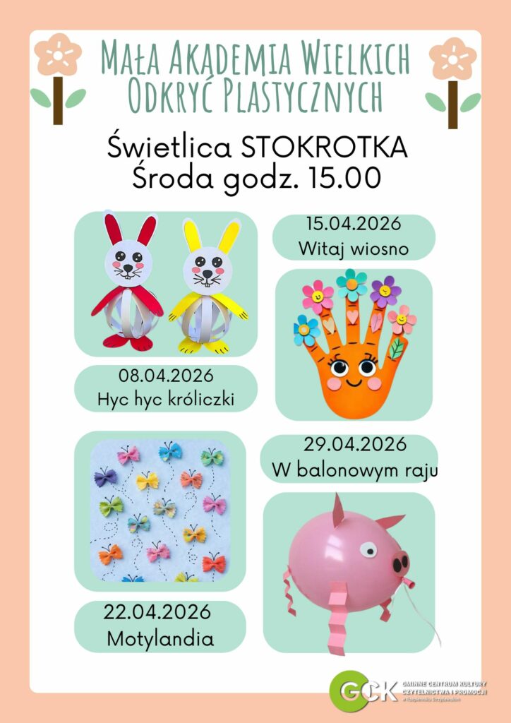 Data kwi 08 2026 Czas 15:00 Mała Akademia Wielkich Odkryć Plastycznych w Turzy Zapraszamy na zajęcia do naszej świetlicy w Turzy. Szczegóły na plakacie. Poleć to wydarzenie + Dodaj do Google Calendar + iCal / Outlook export 00 dni 00 godzin 00 minut 00 sekund